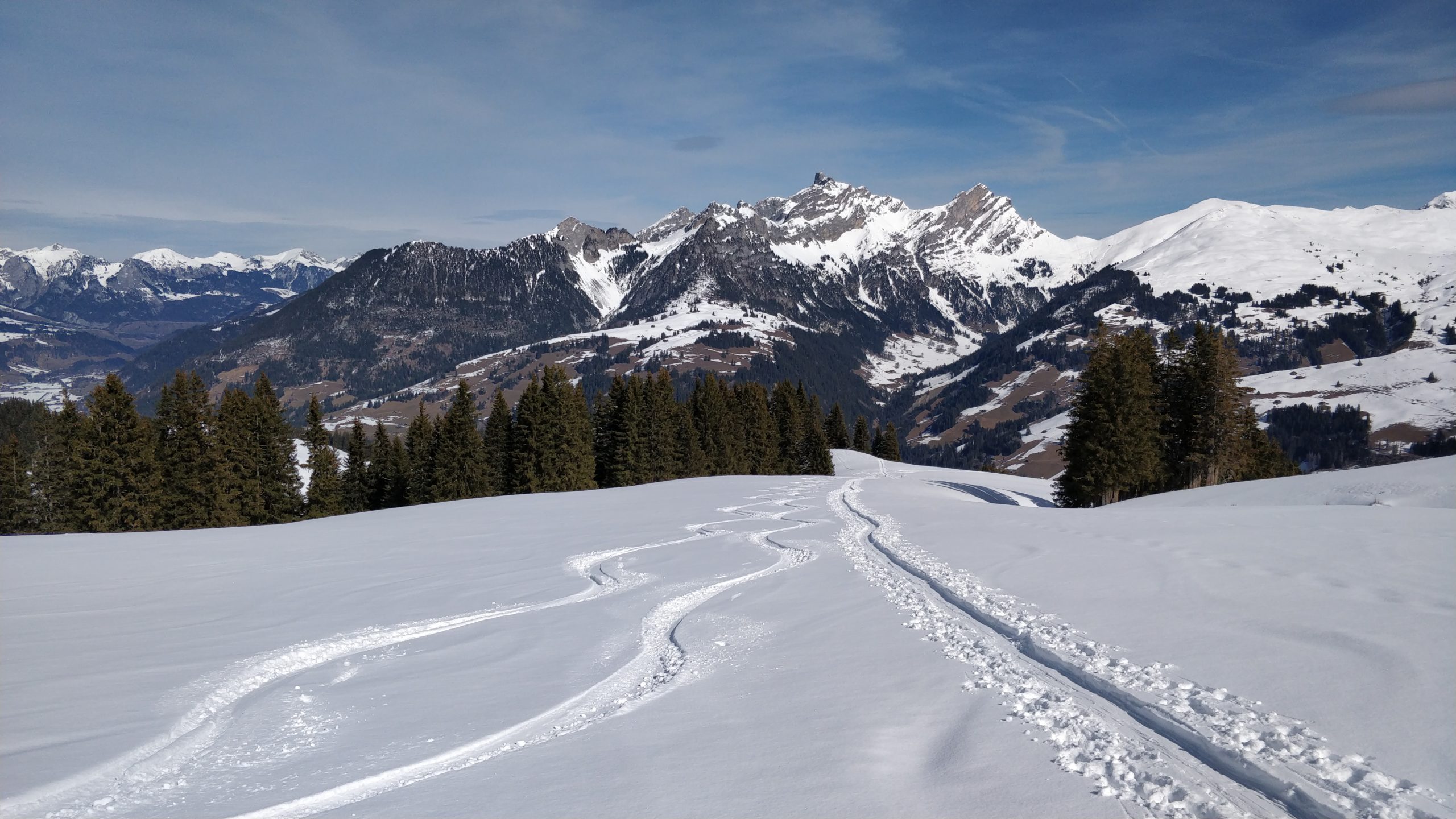 Nach einem kurzen Gespräch mit ein paar Tourenskifahrer und einer Pause an der Sonne ging es an den Abstieg. Ich wählte den direkten Weg via Flösch nach unten. Durch schönsten Pulverschnee führte der Weg mehrheitlich entlang des Wanderwegs bis zur Alp Flösch und weiter zum Eggmatte. Auf die Bögen, welche der Sommerweg hier runter macht, kann man im Winter verzichten. Oberhalb der Eggmatte verlässt die Route den Wanderweg und führt direkt über eine Wiese nach unten. Links und rechts erheben sich die Tannen, geradeaus hat man eine wunderbare Sicht auf die Spillgerte. Bald erreicht man den Wald und gelangt wieder auf den Wanderweg, welchem man schliesslich wieder folgt. Über eine kleine Brücke erreicht man den Undere Chatzestalde und somit die Strasse über welche man aufgestiegen ist.