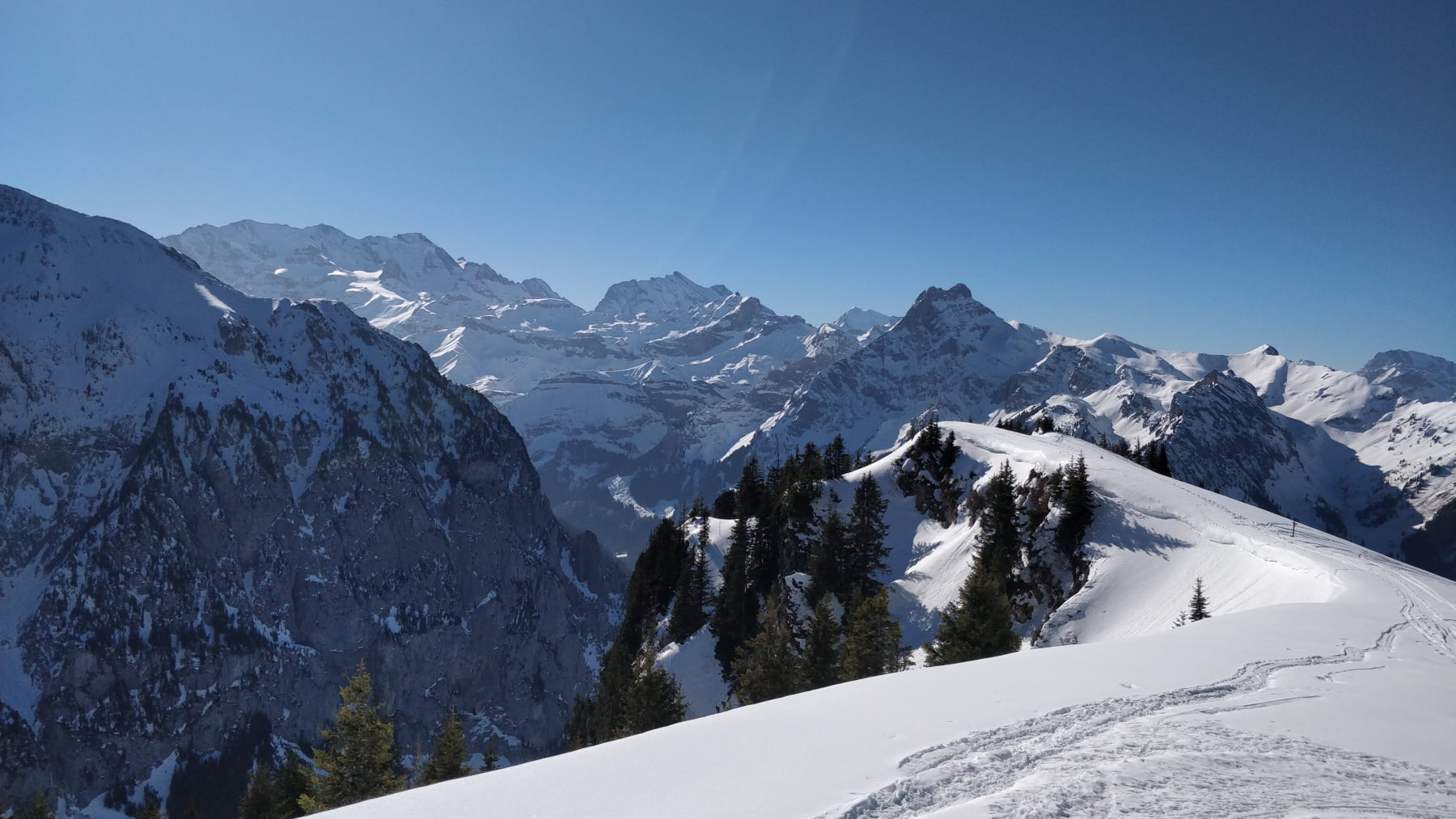 Ab der Alp Engel beginnt der interessanteste und schönste Teil der Tour. Zuerst gibt es aber noch einen kleinen Aufstieg zu überwinden. Gleich nach den paar Häusern geht es kurz steil nach oben, bis die Krete erreicht ist. Ich wählte den Weg direkt nach oben. Je nach Schneesituation gibt es unterschiedliche Varianten. Oben angekommen geht es nun in einem weiten Bogen über ein breites, nicht sehr steiles Feld immer weiter in die Höhe. Je nach Aussicht, die man bewundern möchte, bietet sich die eine oder die andere Seite des Feldes an. Im obersten drittel ist es nun wichtig, nicht mehr dem Wanderweg zu folgen. Dieser führt wieder runter und in Richtung Wätterlatte. Stattdessen geht der Weg weiter nach oben und durch ein kleines Waldstück. Am Ende des kleinen Waldes ist man dann auch schon ganz oben angekommen. Je nach Schneehöhe kann man es sich nun auf dem Bänkli oder im Schnee gemütlich machen und die wunderbare Aussicht über den Thunersee auf der einen, und die Berge auf der anderen Seite geniessen.